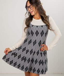 The Frosted Argyle Heather Grey Sweater Dress features a grey knit base with bold black-and-white argyle detailing for a timeless, preppy look. The stretchy, soft fabrication makes it an easy all-day wear, while the shift-style silhouette keeps it flattering and effortless. Style it with tights and boots for winter, or layer with a longline coat for a chic, elevated outfit.
