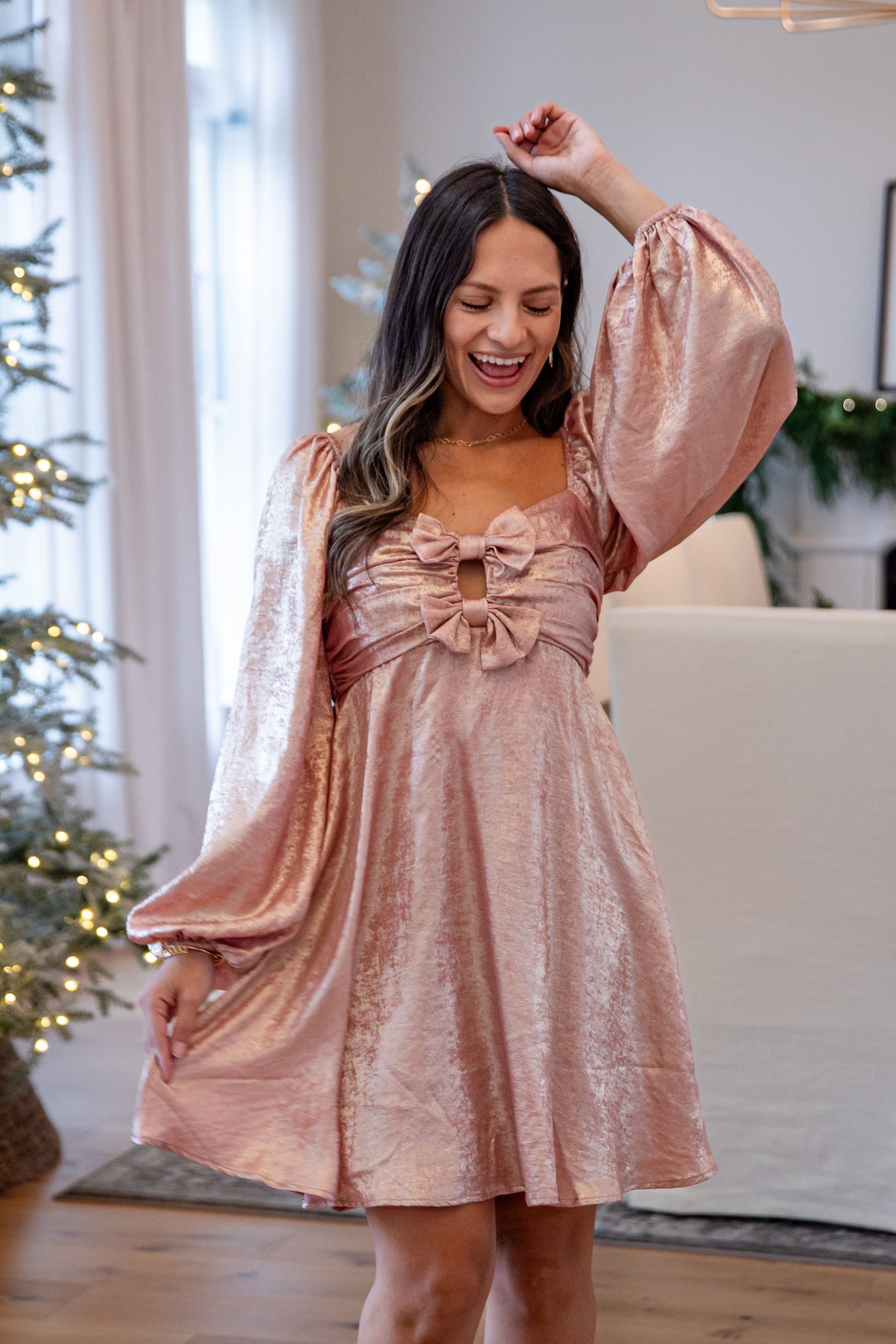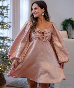 Slip into the Glistening Blush Metallic Mini Dress and let the holiday magic begin. With its luxe metallic sheen, romantic draped neckline, and soft fluttery silhouette, this dress radiates festive femininity. Whether you’re attending a holiday gala, Christmas soirée, or a winter wedding, this dress delivers shine and elegance without trying too hard. It’s glam, girly, and downright stunning.