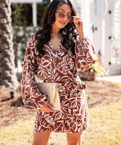 The Wandering Heart Brown Print Wrap Mini Dress brings warmth and charm to your wardrobe. Designed with a rich brown-and-cream botanical print and a relaxed silhouette, this dress feels cozy yet polished. Pair it with wedges and some accessories for an effortlessly styled outfit. Perfect for Spring wardrobe transitions!